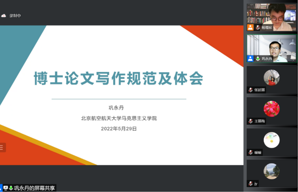 2022年5月29日,澳门网投唯一官网线上举办“研究生学位论文指导系列讲座”第一讲。本次讲座聚焦博士学位论文写作,由我院博士毕业并分别获得“首届全国高校马克思主义理论学科优秀博士学位论文”、“澳门网投唯一官网优秀博士学位论文”的北京工业大学澳门网投唯一官网副教授陈艳飞、北京航空航天大学助理教授巩永丹两位老师做分享。讲座以腾讯视频线上方式进行,学院博士生、部分硕士生以及校内外其他同学约320人在线学习。学院副院长杨增岽教授主持了讲座。 陈艳飞副教授以“博士学位论文写作的三境”为主题,围绕博士论文写作历程,从论文选题确立、初稿撰写以及修改完善三个环节就如何撰写学术论文进行了精彩的讲授。陈老师认为博士论文选题要以“高”“尽”“独”为遵循,养成关注各类学术信息的良好习惯,并善于在研究中确定研究方向。同时在论文撰写过程中,要从核心概念界定、研究框架确立、写作资料搜集等方面下足功夫。最后,陈老师还为同学们介绍了PROCESS ON等实用的论文写作与分析工具。 巩永丹助理教授以“马克思主义理论学科博士论文写作规范”为主题,以马克思主义基本原理专业博士论文写作为例,提出“阅读经典是基本功,选好题目是硬道理,用好文献是要选择,守好规范是大前提,选对方向是关键点,最终通过是总目标”的论文写作要求。巩老师提出阅读经典的三层次即拓宽阅读的面,确定阅读的点,连接阅读的线,同时指出在选用文献的过程中对最新研究成果要做到批判性吸收。最后还从论文写作规范、送审、提交等方面提出了需要注意的问题。 两位分享嘉宾还认真选答了参会同学的的提问。整个讲座受到广泛好评。 讲座最后,杨增岽老师对两位老师的分享交流表示衷心感谢,从四个方面总结概括了分享嘉宾在写作博士论文过程中的共性优点;结合近年来博士学位论文评阅与论文抽查的情况做了介绍,认为不同的目标要求和自觉意识决定了对待学位论文的不同态度;指出博士学位论文写作从打心底里喜欢做学术研究进而确立一个好的选题作为开始,是博士生的学养、学识、学风与研究能力的集中反映,选题过程是学术旨趣、选题价值、个人能力、导师关注等多重因素有机结合从而做出最佳决定的过程。杨老师同时指出,研究方法、研究思路与研究结论要经得起逻辑推敲,要在循序渐进上下功夫,任何“一招鲜”或“绣花拳”都是难以为继的;勉励大家进一步增强学位论文的重视度,尽早进入写作最佳状态。杨老师表示,学院将进一步为博士生写好学位论文提供积极指导,后续还将陆续采取多种形式深入开展专题论文写作指导。